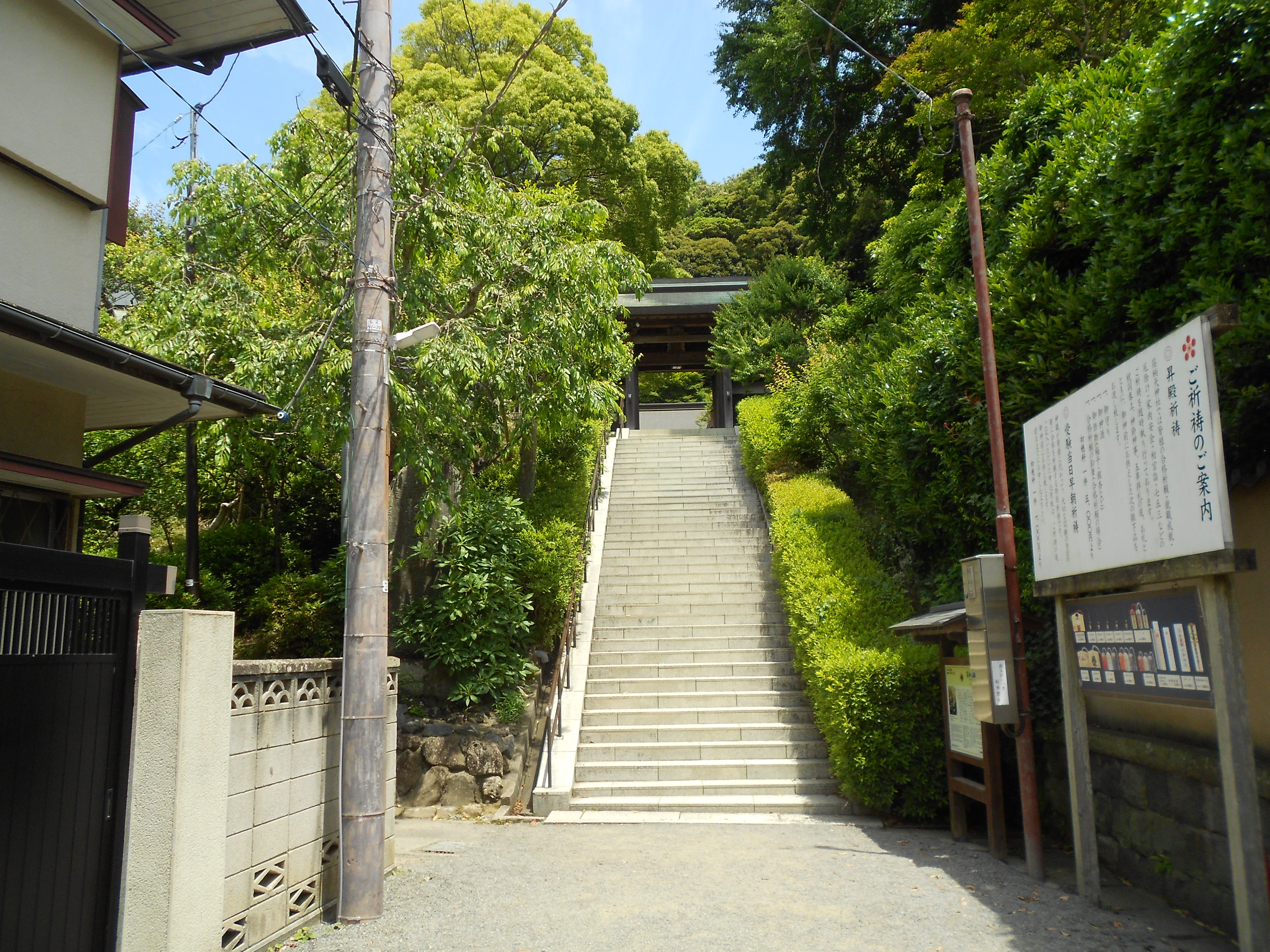 参道には二つの木が傾いているところをくぐり、鳥居もくぐり、すると石段があり、登っていくと神門があり、 そこを進むと、本殿がある。