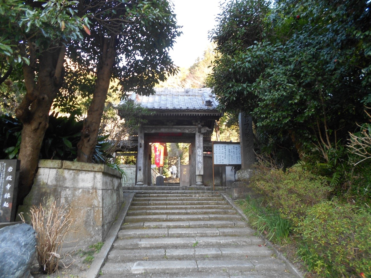 逗子駅から市街地を抜け、さらに細い道を進みます。路地と呼ぶのがふさわしいほど狭く、車が一台通れるかどうか…いや、 通れないほどの幅の道を縫うように歩いていくため、道に迷いやすい場所です。 幸いにも道標があるので、それを頼りに進み、なんとか迷わず岩殿寺へ到着しました。 山門をくぐるとすぐに急な石段が現れ、ここは体力を温存していないと息が切れてしまうほどです。 登りきった先から海方面を望む景色は、息をのむほど美しい眺めが広がっています。