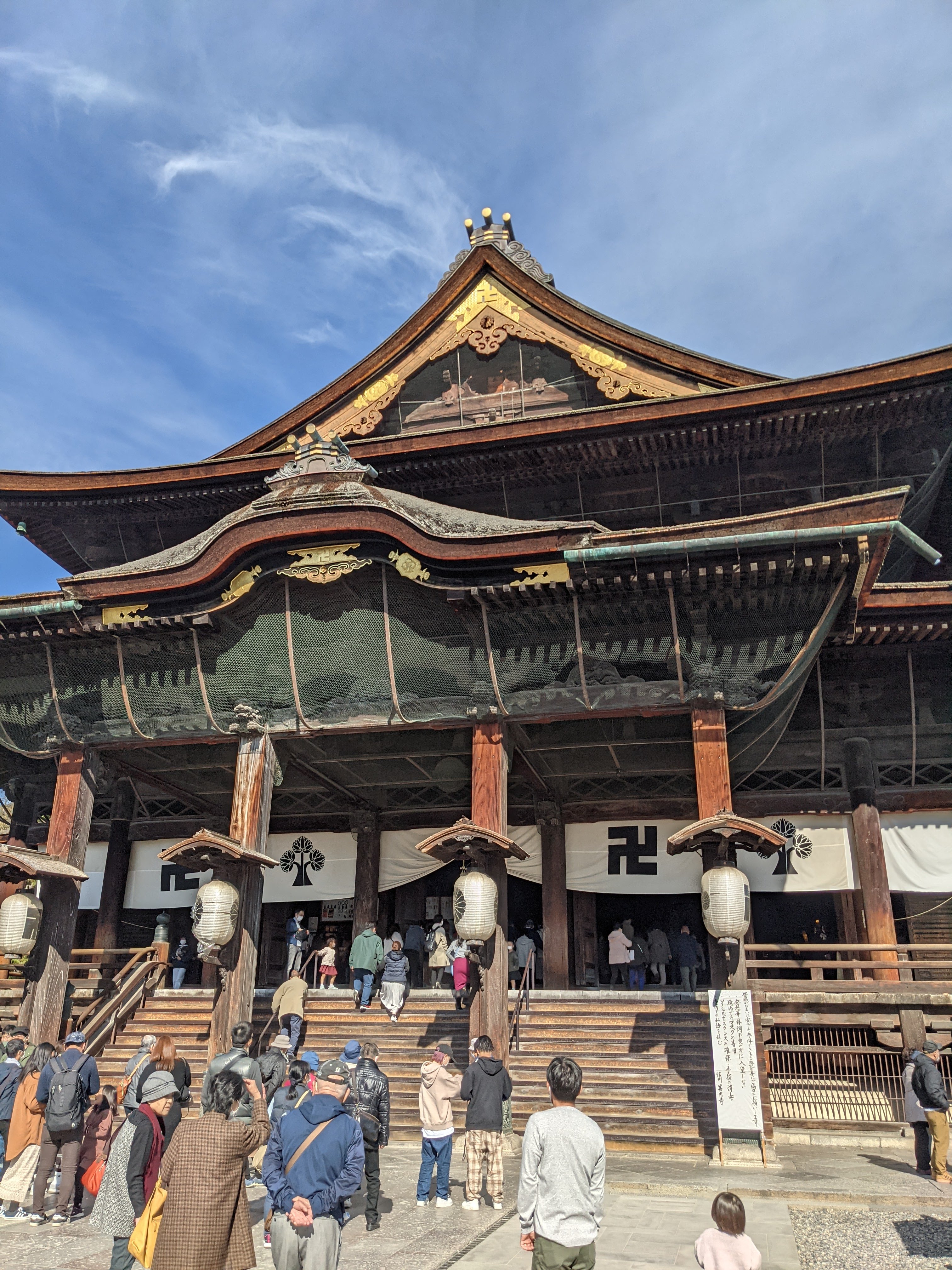 長野駅から善光寺の参道があり、真っすぐ進むと仁王門、山門、本堂と真っすぐに進むと主な施設が見れる。