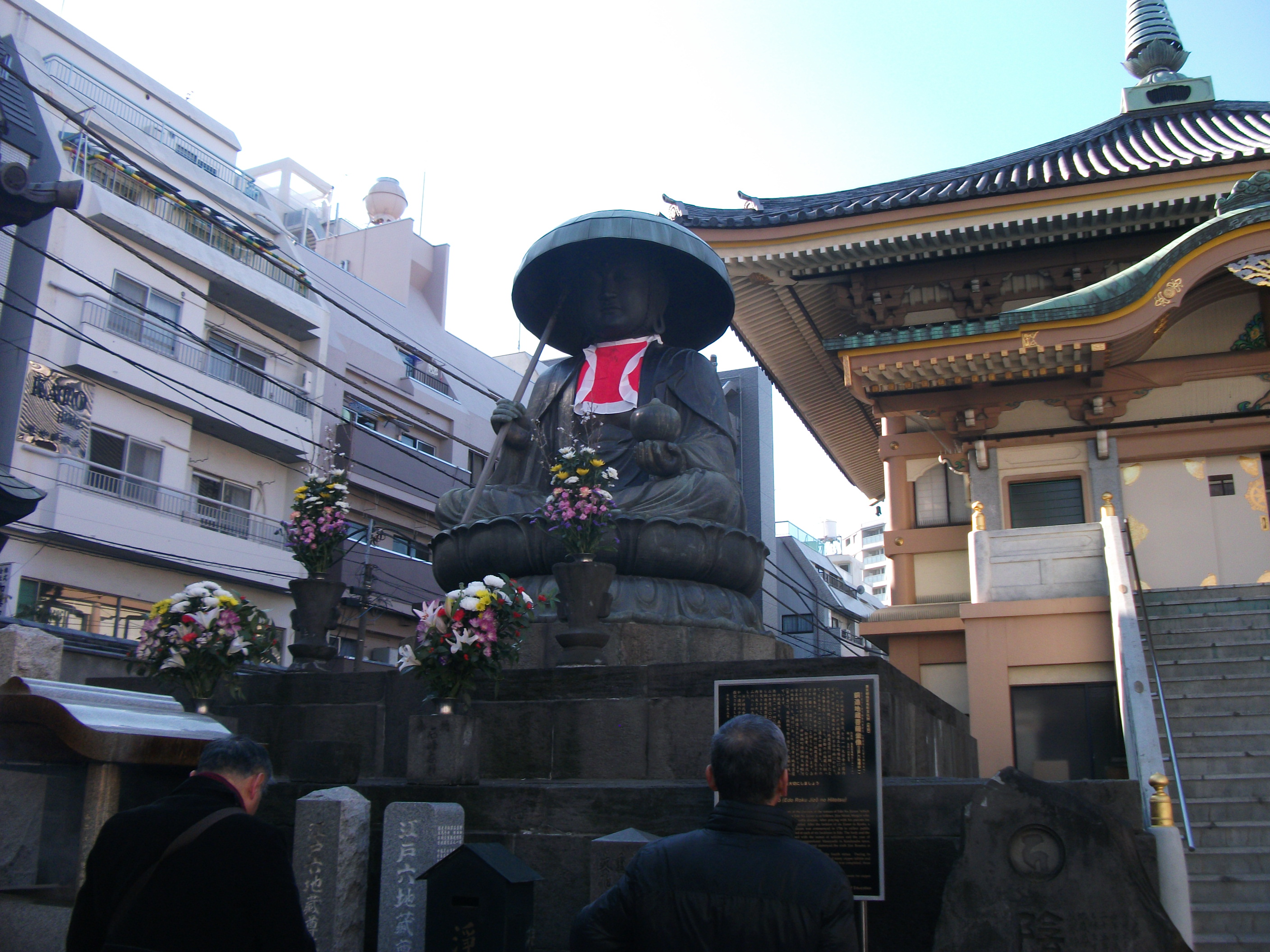 巣鴨の商店街の一角にある。境内の入口には寺院名が書かれてあり、目の前に大きな地蔵菩薩 が見える。そこで拝んで、本堂が右手奥にあるので、そこでまた拝む。