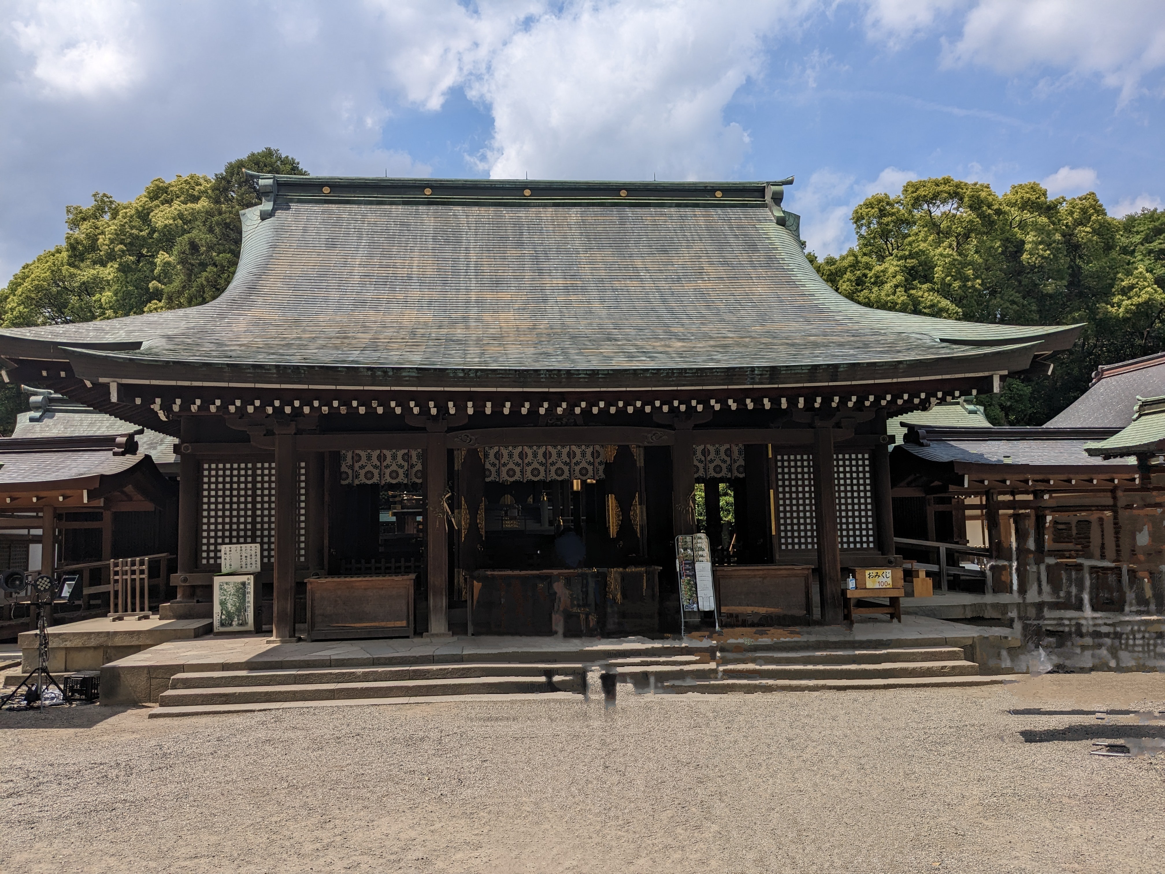 境内に通じる参道の入口に立つと両脇に並木道になっていて、普通の神社とは格の違いがわかる。そこをかなり真っすぐ 進むとやっと本格的な境内にはいる。まず三の鳥居があり、次に楼門、舞殿、拝殿となる。本殿は直接は見えにくくなっている。