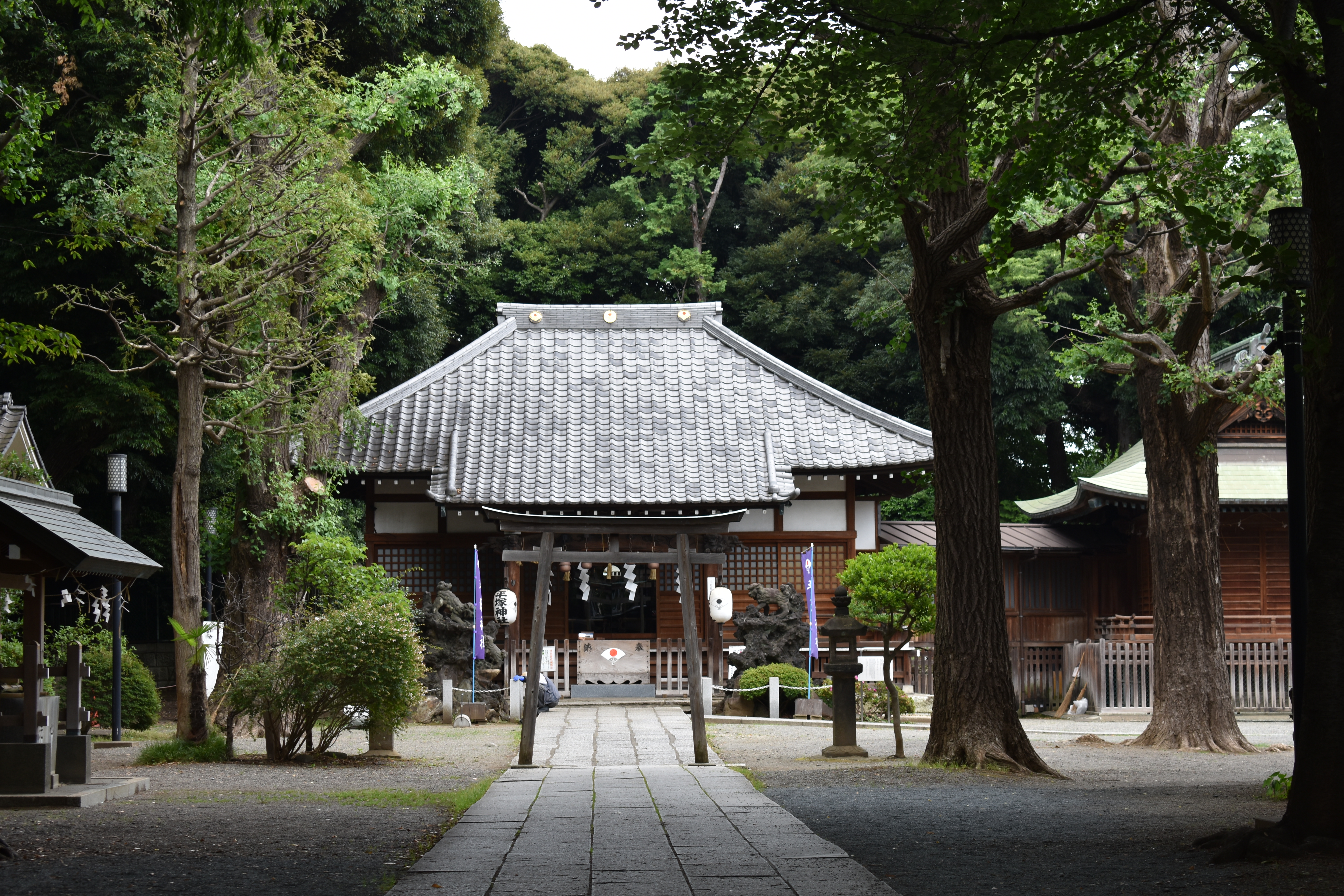 上中里駅を降りて坂を上っていうと右側に神社らしい雰囲気のあるものが見える。坂を上り切って 境内の前に立つと前には駐車場があり、真っすぐ進むと社殿が見える。左側に祠が数社ある。